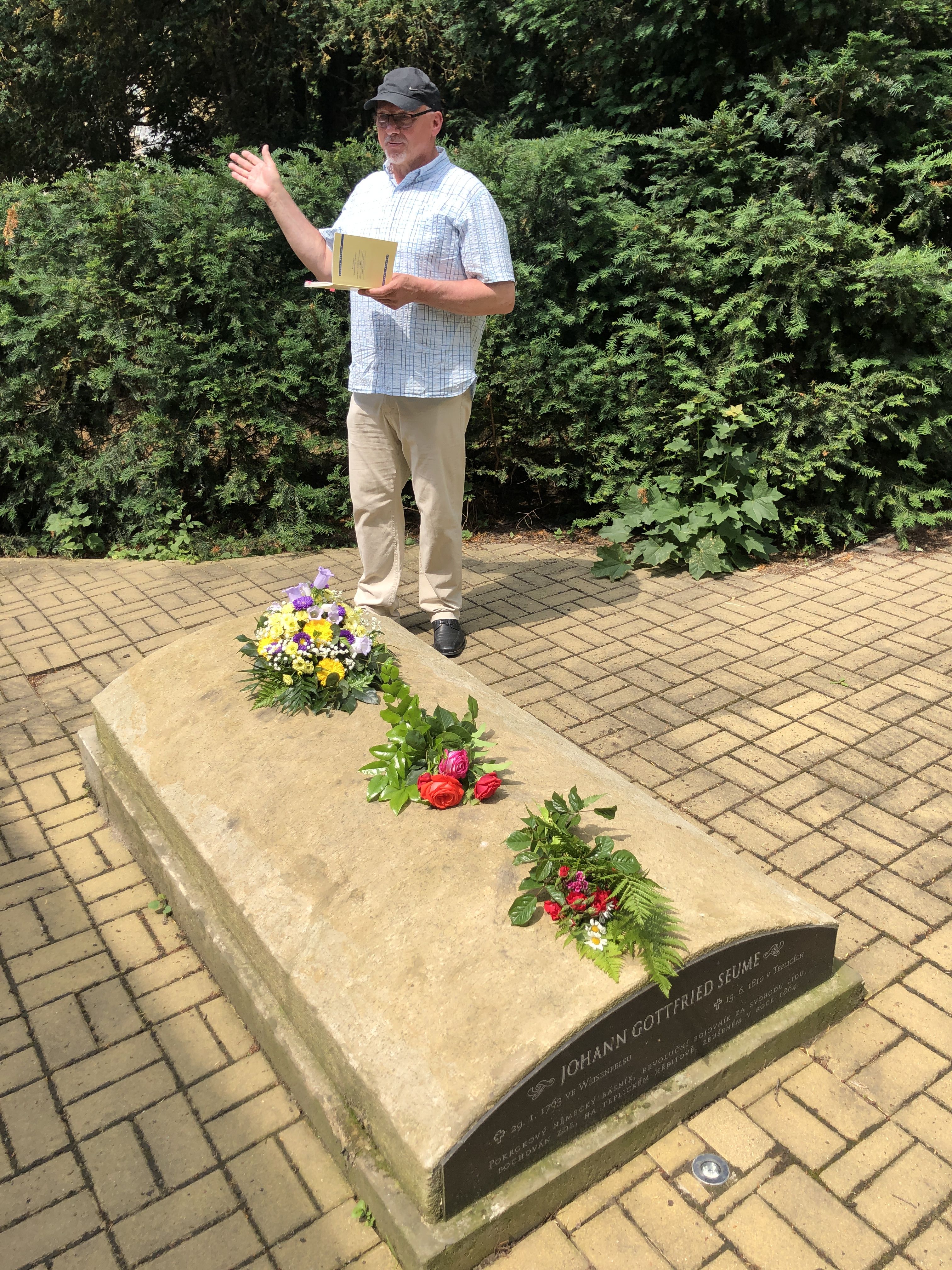 Tags zuvor sind wir noch von Leipzig nach Grimma, auf dem Weg unseres Seume spaziert, heute nun das Innehalten an seinem Grab. Ein ereignisreiches Jahr liegt hinter uns: Das Projekt Seume-Weg ist gestartet, die Seume-Tagung „Von Sachsen in die Welt“ hat erstmalig als Präsenzveranstaltung mit großer Beteiligung stattgefunden, wie auch die verschobene 11. Seume-Literaturpreisverleihung an Frau Bettina Baltschev für ihr Werk „Am Rande der Glückseligkeit. Und erstmalig konnte auch eine grenzüberschreitender Workshop für Studenten organisiert werden, Thema: „Bildungsreisen und Wanderschaften Reiseliteratur der Aufklärung am Beispiel von Johann Gottfried Seume“. Der Austausch fand mit der Jan-Evangelista-Purkyne-Universität in Usti nad Labem statt. Frau Dr. Veronika Jicinska hat uns hierbei in besonderer Weise und Umfang unterstützt.