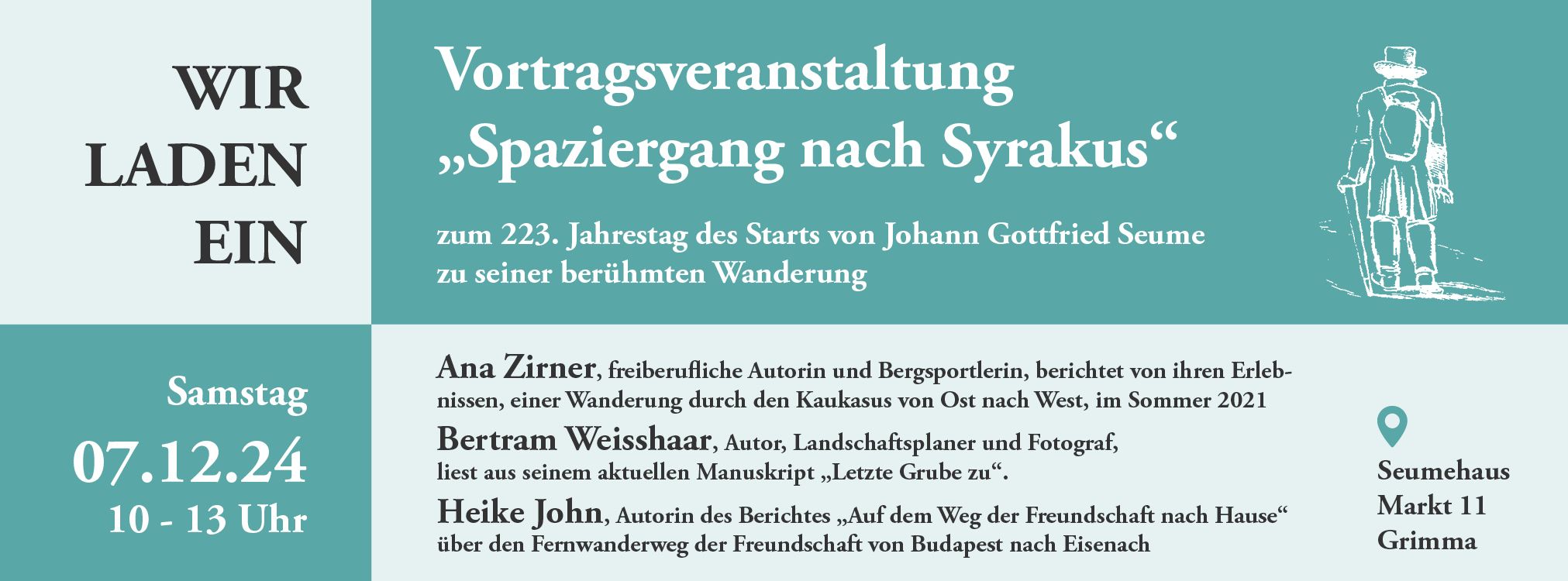 Die Seume-Gesellschaft veranstaltet alljährlich Anfang Dezember zum Jahrestag des Starts von Johann Gottfried Seume zu seinem ‚Spaziergang nach Syrakus’ eine Vortragsveranstaltung in Grimma, in diesem Jahr mit folgendem Programm: