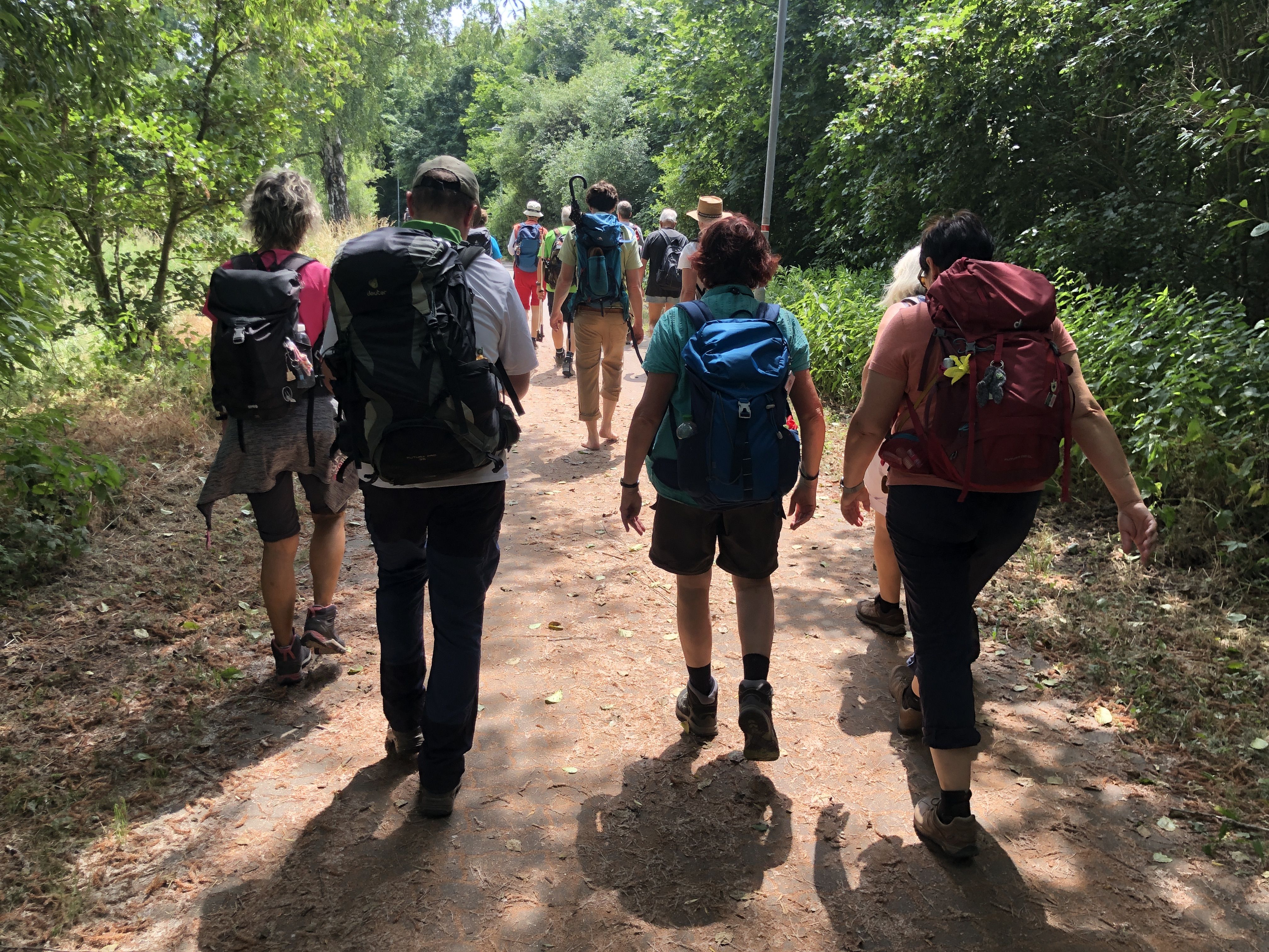Aus diesem Anlass verlief unsere traditionsreiche Wanderung auch ausnahmsweise von Leipzig nach Grimma. Rund 20 Wanderfreunde trafen sich dazu morgens 9:30 Uhr in Leipzig am Monarchenhügel, von Verkehrslärm umtost und bei leichtem Regen. Neben Veteranen der Wanderung aus der Seumegesellschaft und deren Umfeld hatten sich auch Erstteilnehmer wie beispielsweise vom Wanderverein Burgstädt eingefunden, um die 26 km bis Grimma gemeinsam zu bewältigen. Sowohl das Wetter wie auch der Verkehrslärm besserten sich, so dass zur Halbzeitspause in Naunhof hin dann die Wege bei bestem Sonnenschein durch Felder mit Kornblumen und Klatschmohn am Wegesrand führten. Gegen 16:30 Uhr angekommen Grimma ging es zum Ufer der Mulde, im Klosterhof beim Treff zum Wandertag gab es dann Begrüssung und Teilnahmeurkunden, wie auch diverse Verpflegung.